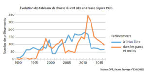 Jusqu’en 2012, les populations de sika n’ont cessé d’augmenter un peu partout en France. Selon l’inventaire le plus récent (2018), 84 communes dans 19 départements de France étaient encore concernées par la présence de cerfs sika en liberté ! Cause principale : les échappés d’enclos de chasse… Mais aussi, une volonté locale de « gestion cynégétique » des populations…