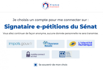 C’est comme vous voulez. Vous avez juste besoin des identifiants que vous utilisez pour vous connecter à l’un de ces 5 sites, et le tour est joué ! Cela prend une poignée de secondes : vous n’avez rien à valider par e-mail, vos données personnelles ne sont pas conservées, et votre nom ne s’affichera pas sur la pétition. Seule une notification vous sera envoyée par e-mail pour confirmer que vous vous êtes bien connectés sur FranceConnect.