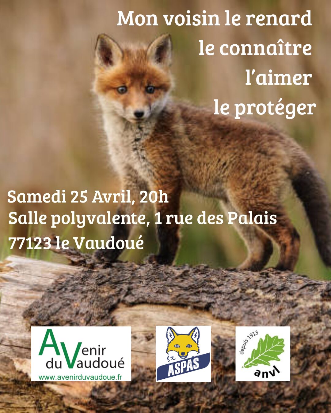 La délégation ASPAS 77 présentera une conférence intitulée “Mon voisin le renard, le connaître, l’aimer, le protéger” aux côtés de l’Association Avenir du Vaudoué.