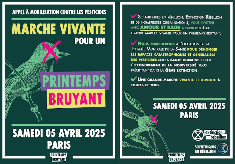 Le samedi 5 avril 2025, à Paris, l’ASPAS participe aux côtés de nombreuses organisations à la Marche vivante pour un printemps bruyant, portée par les mouvements Scientifiques en rébellion et Extinction rébellion pour dénoncer les impacts catastrophiques et généralisés des pesticides sur la santé humaine et la biodiversité.