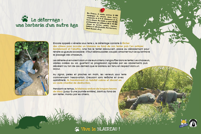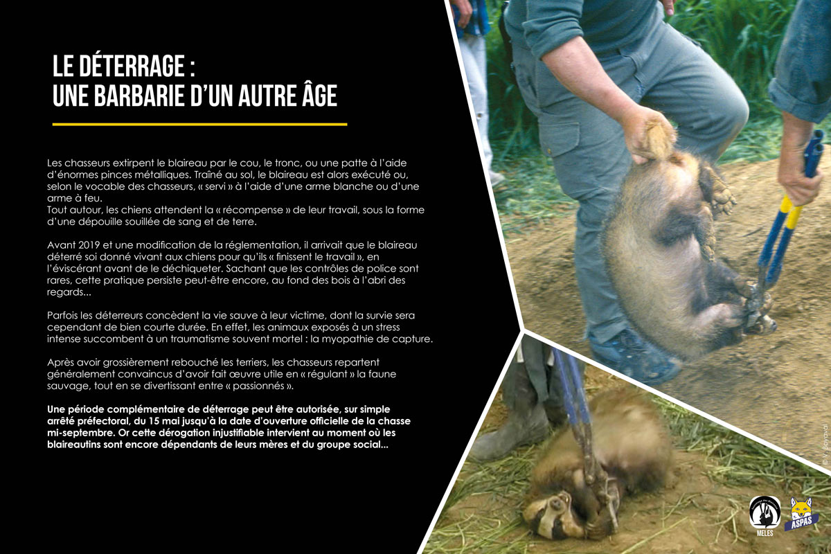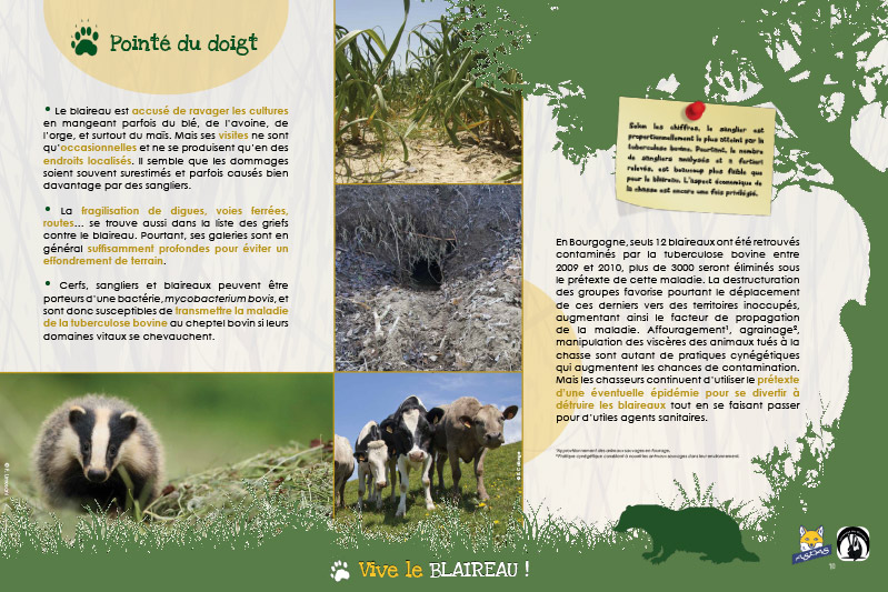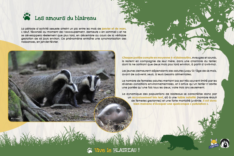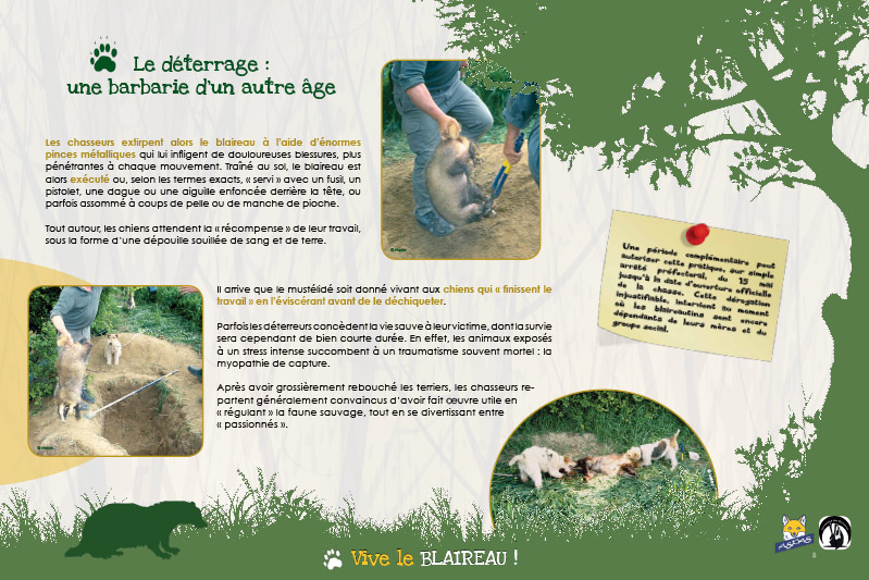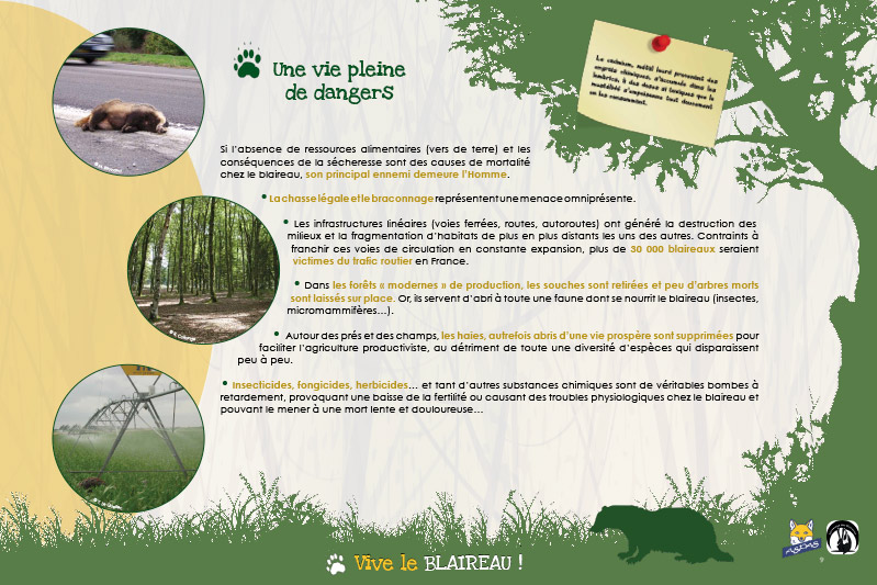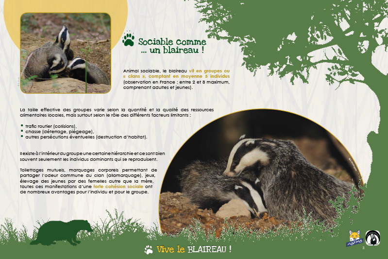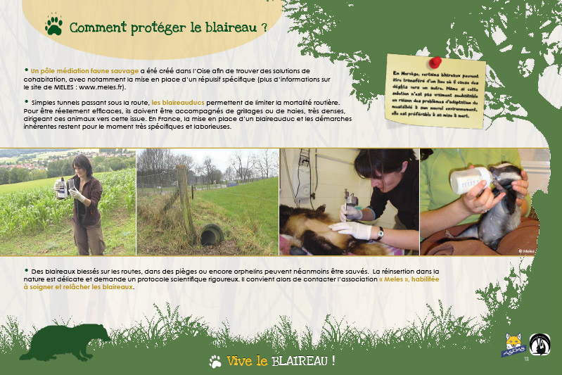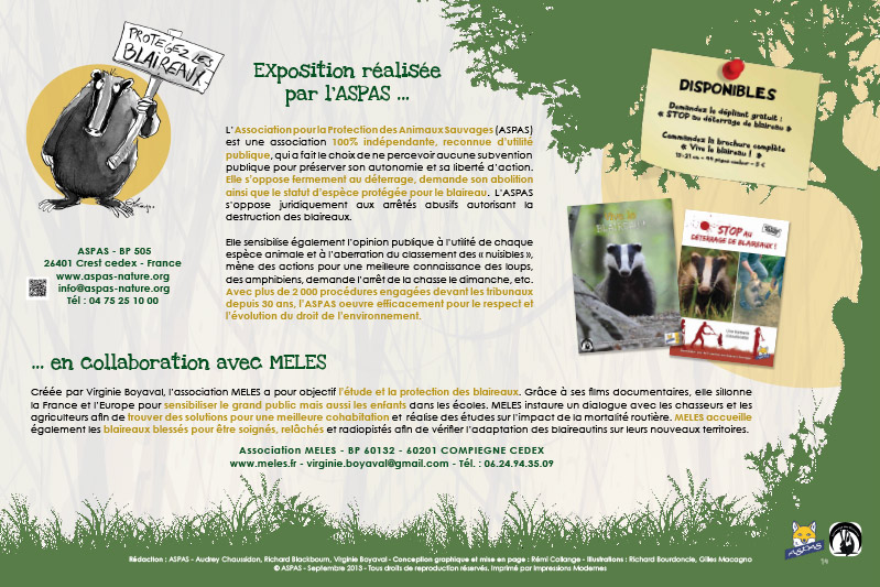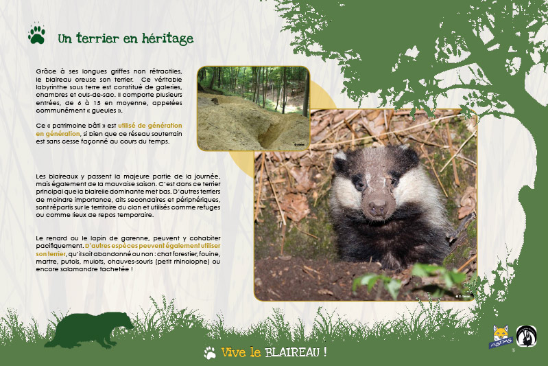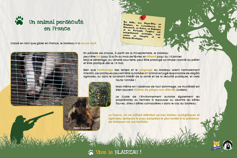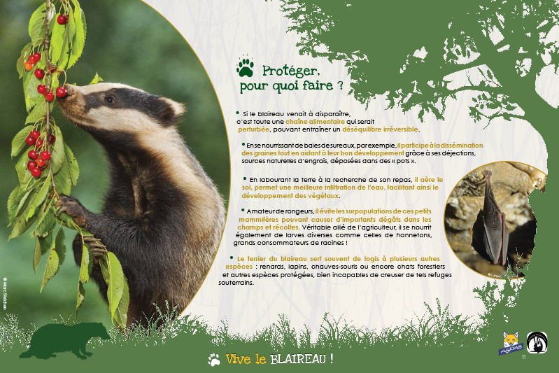 Elle dénonce la pratique barbare du déterrage et les nombreuses persécutions dont le mustélidé est victime, donne des conseils d’observation ou encore de protection. Découvrez cet animal fascinant et utile grâce aux magnifiques clichés réalisés par des photographes naturalistes renommés. La meilleure façon de protéger le blaireau reste la connaissance objective de cet animal. L’exposition « Vive le Blaireau ! » y contribue.