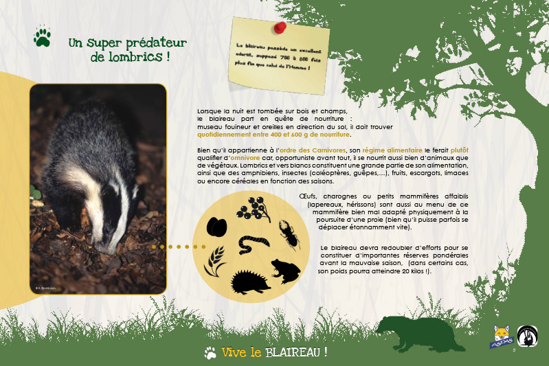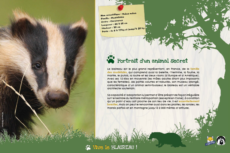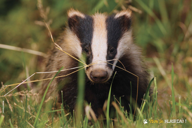 Avec sa tête noire et blanche, le blaireau est un peu notre panda. Secret, nocturne, mal connu, il mène une drôle de vie. Il aime tellement se nourrir de vers de terre que certains le traitent de « lombrico-dépendant » ! Propret, il fait ses besoins dans des « pots ». Tolérant, il peut partager son terrier avec d’autres espèces .