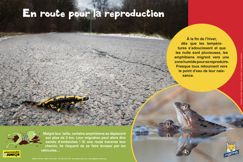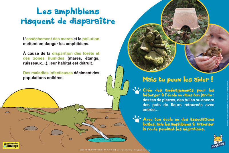 L’ASPAS met gratuitement à disposition des écoles, clubs nature ou centres d’animations un kit de sensibilisation « J’aime les amphibiens ! », dans la limite des stocks disponibles. Composé d’une exposition de 9 panneaux (60 x 40 cm), de dépliants pour les enfants et d’une documentation supplémentaire pour l’enseignant / animateur, ce kit permettra de mieux faire connaître notre patrimoine naturel et d’engager le débat sur la cohabitation avec la faune sauvage.