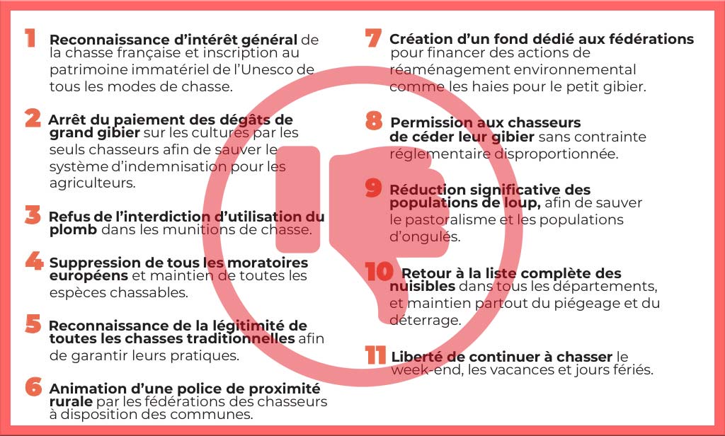 S’estimant victime “d’attaques injustifiées qui viennent notamment de Bruxelles, de technocrates adeptes de la norme et déconnectés de la réalité, des anti-tout et des écolos dogmatiques”, la Fédération nationale des chasseurs (FNC) invite tous ses membres, partout en France, à aller à la rencontre des maires de leurs communes, le 17 mai prochain, pour leur remettre un “Manifeste de la chasse française” avec 11 revendications délirantes :