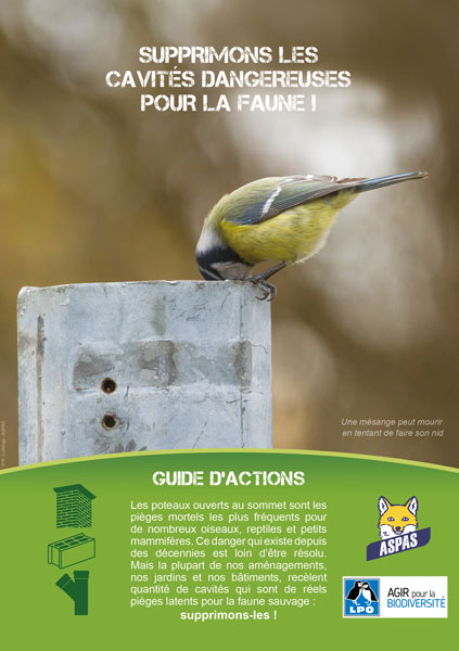 Les poteaux ouverts au sommet sont des pièges mortels pour de nombreuses espèces animales. La plupart de nos aménagements, jardins et bâtiments recèlent quantité de cavités. Supprimer ces pièges est à notre portée !