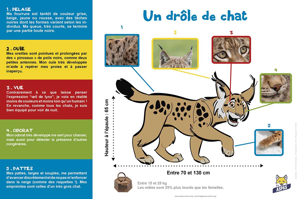 Qui est vraiment le lynx ? Où vit-il et quelles sont ses habitudes ? Pourquoi est-il important de le protéger ? Pour sensibiliser les adultes de demain au respect des grands prédateurs et de la biodiversité, l’ASPAS édite le kit pédagogique « J’aime les lynx » à destination des jeunes enfants (entre 6 et 11 ans) et les invite à la rencontre de ce discret mammifère. Constitué d’un dépliant A5 en trois volets et d’une exposition didactique en 8 panneaux (40 x 60 cm), cet outil peut être utilisé en classe, en centre de loisirs… et même à la maison pour les parents les plus motivés !
