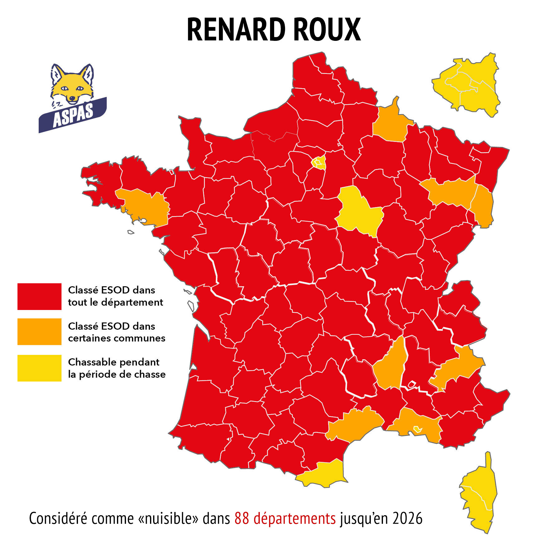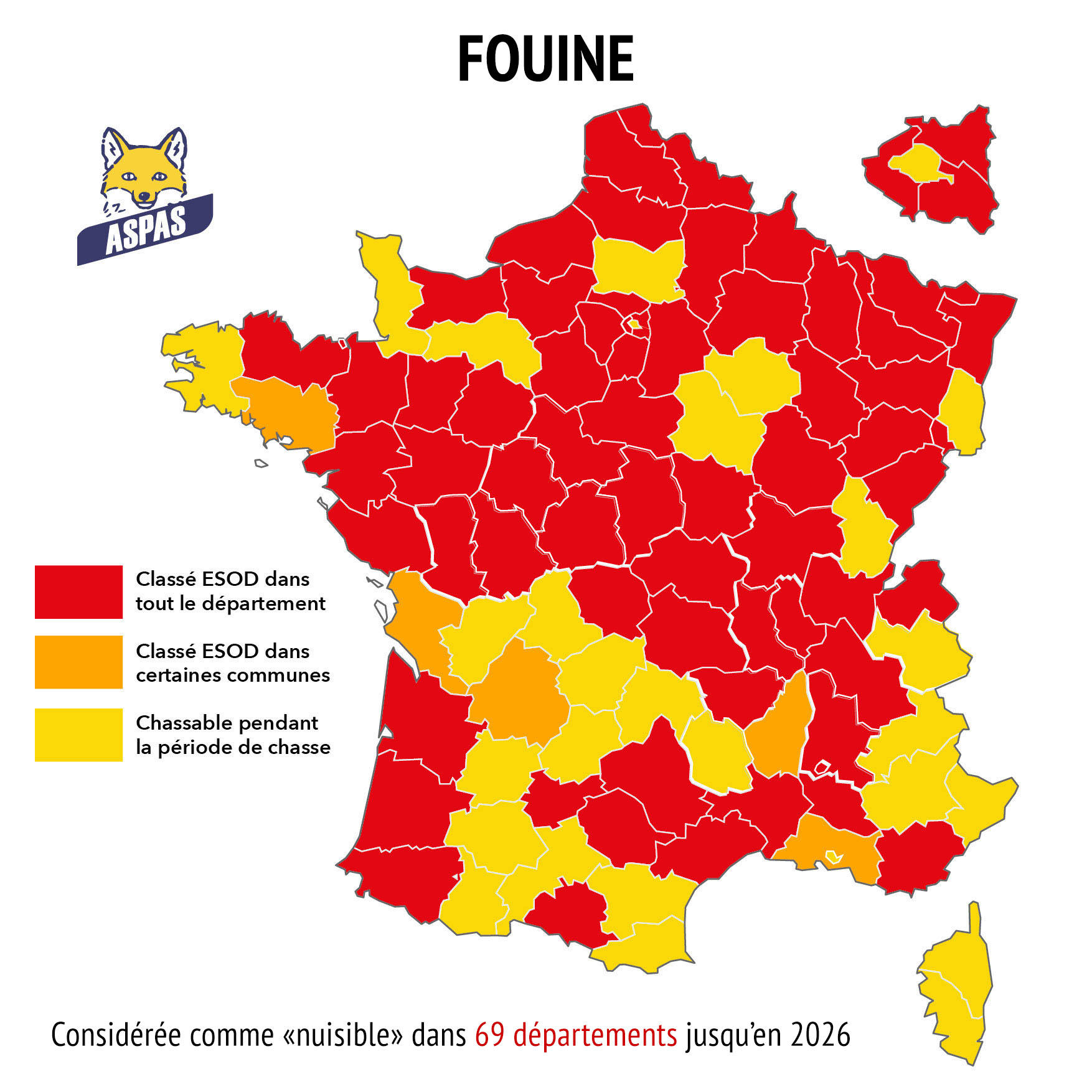 L’ASPAS, association 100% indépendante, milite en faveur des “nuisibles” depuis les années 80 et a remporté de nombreuses victoires juridiques qui ont permis toutes ces années de sauver des millions de renards, martres, pies et autres mal-aimés. Grâce à notre dernier recours devant le Conseil d’Etat, le putois a pu sortir de la précédente liste ESOD et de nombreux renards ont pu être épargnés des massacres dans plusieurs départements.