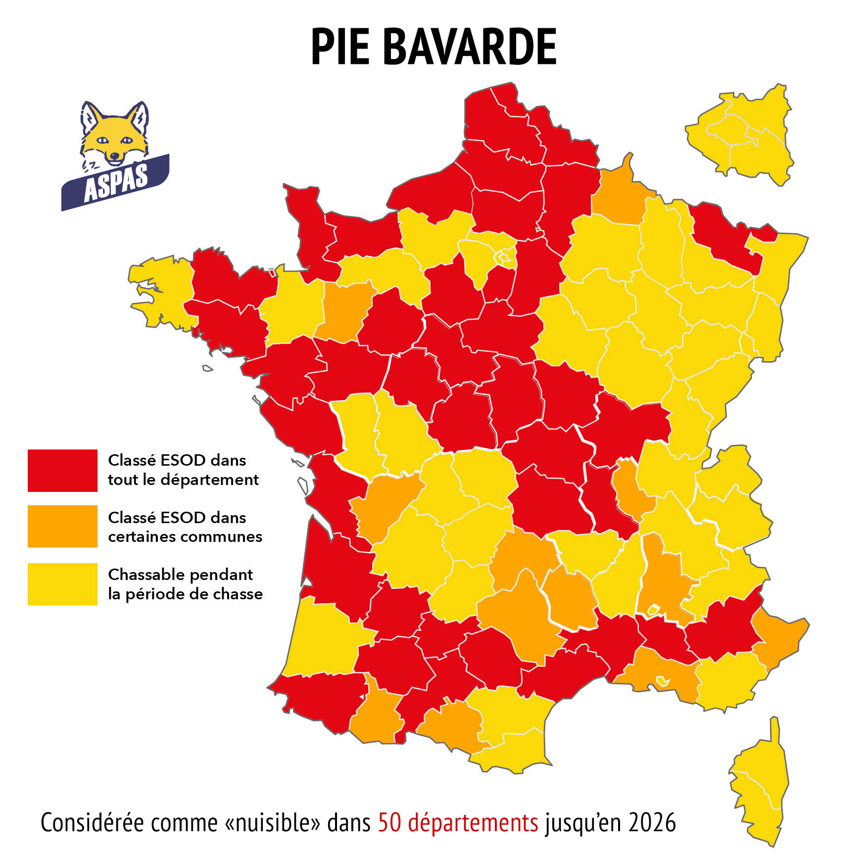 - Une légère avancée pour la pie, qui voit son classement ESOD réduit de 9 départements (50 au lieu de 59)