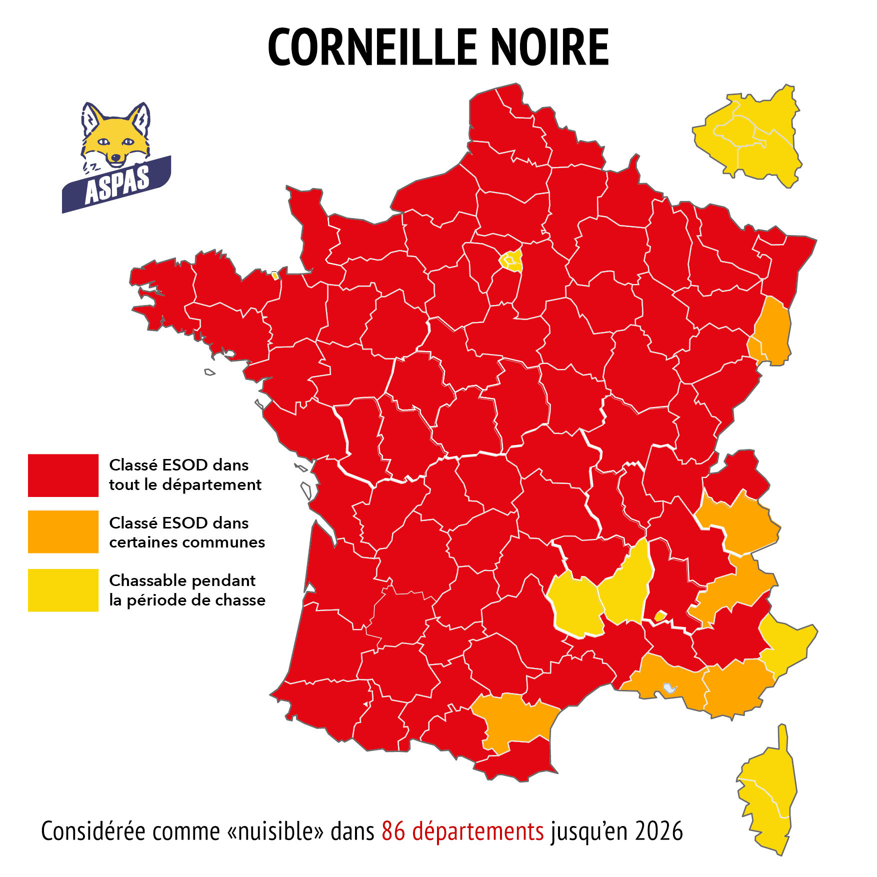 L’avenir est en revanche plus sombre pour la corneille noire et le corbeau freux, deux corvidés qui voient leur classement ESOD s’étendre à de nouveaux départements…